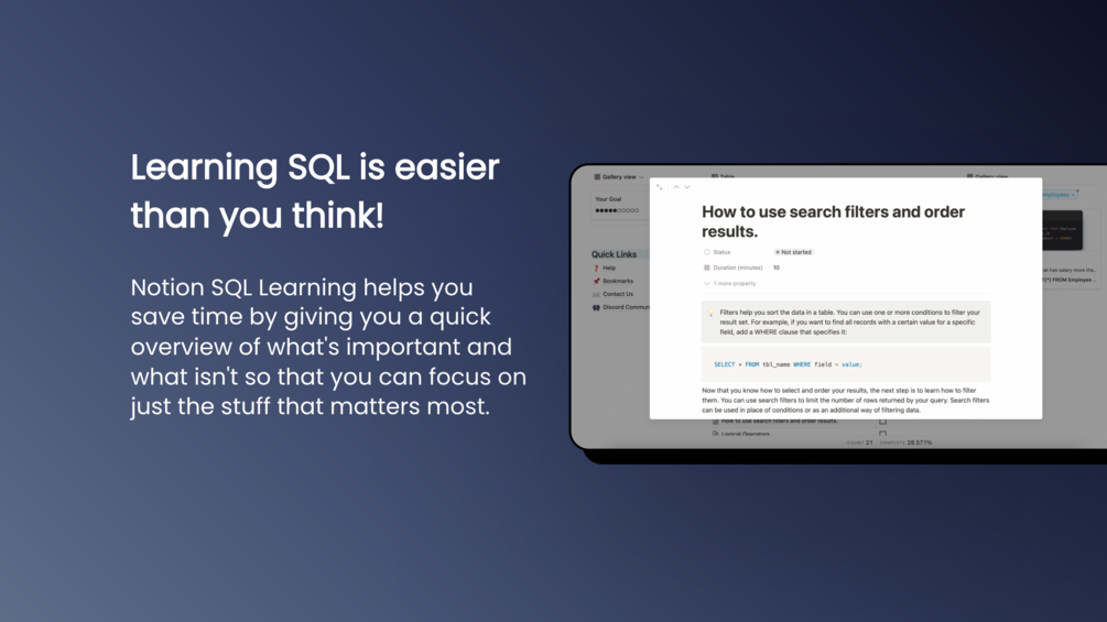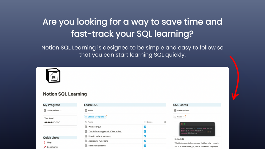 - Notion SQL Learning will keep track of your progress so that you always know how much more there is left for you to learn.