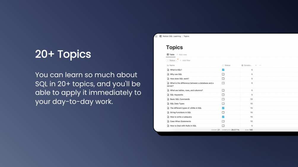 Notion SQL Learning is designed to be simple and easy to follow so that you can start learning SQL quickly. It is divided into 20+ topics so that you can learn SQL in bite-sized chunks.